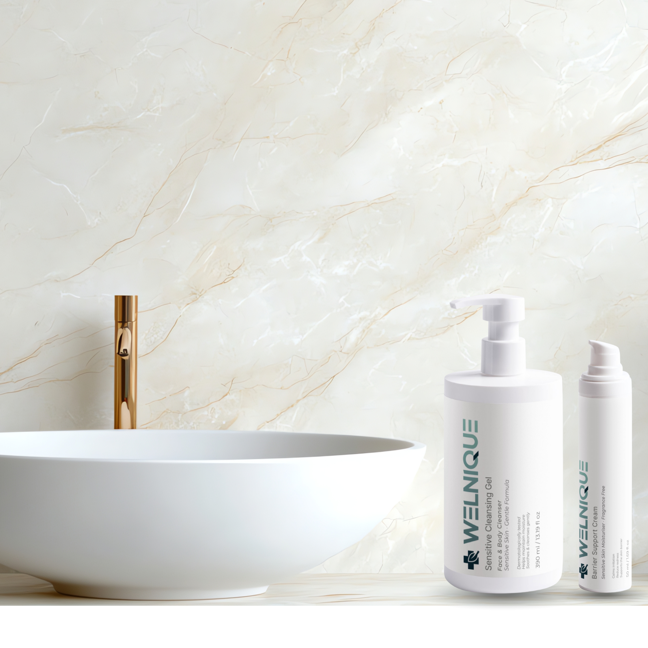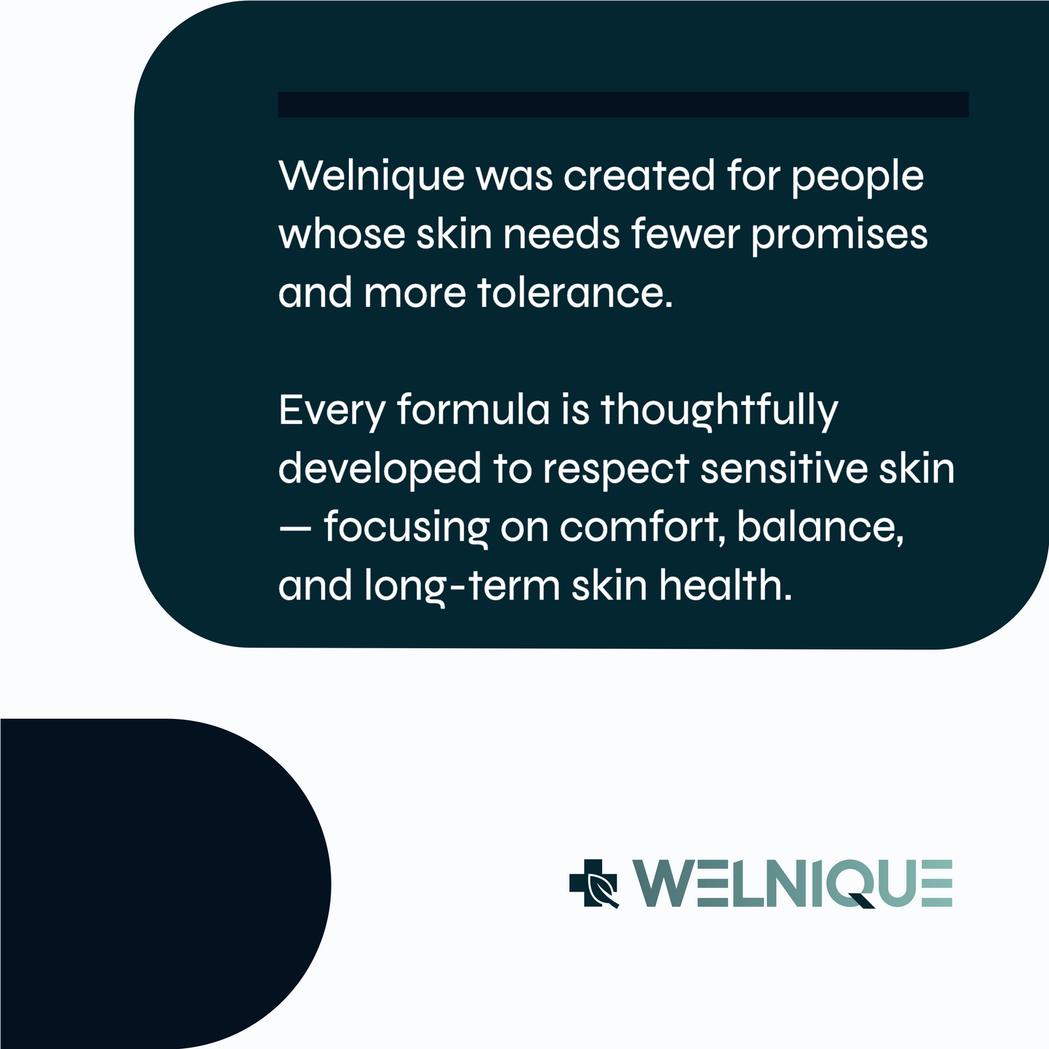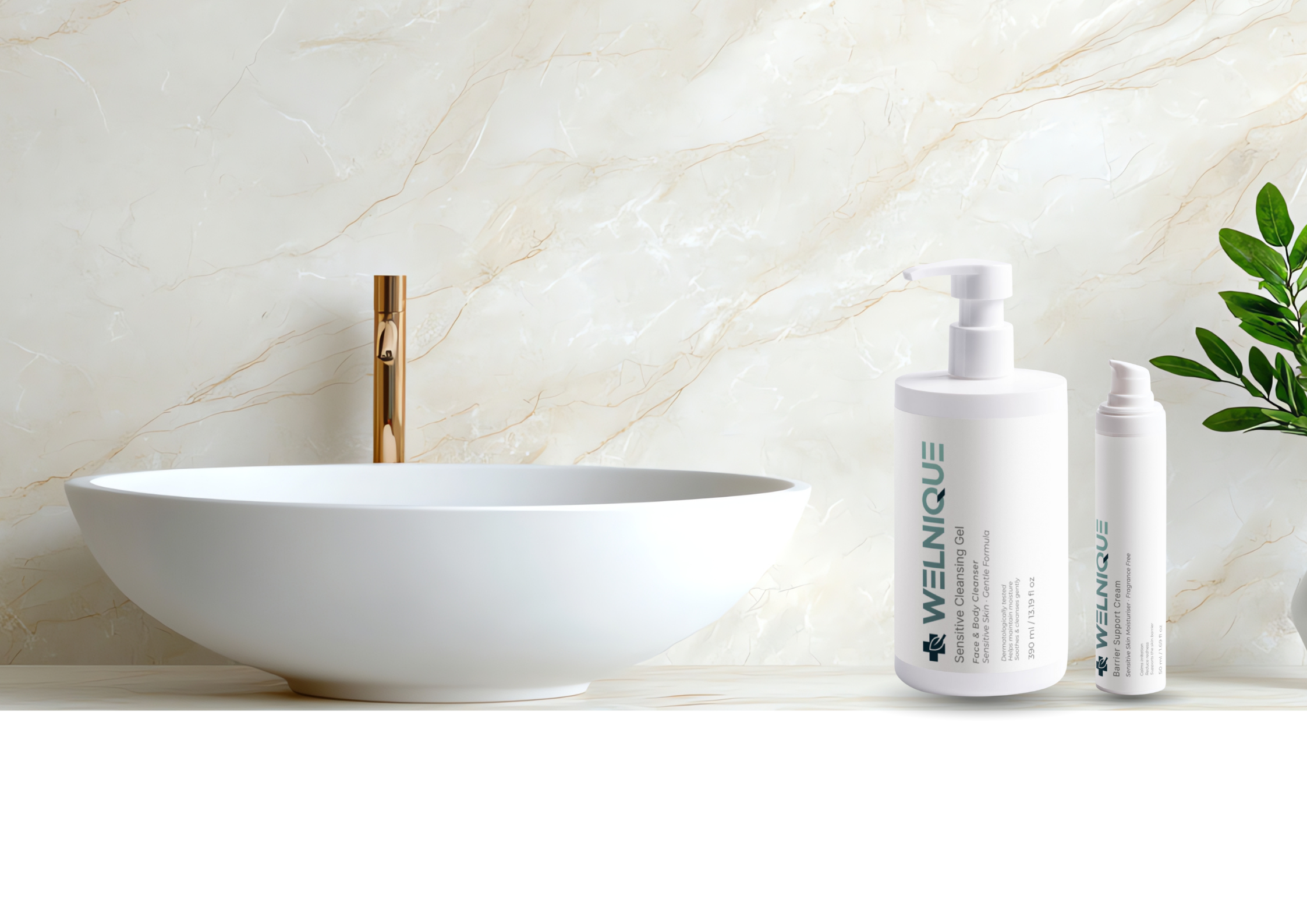 If your skin feels tight, irritated, or red — especially after cleansing — your skin barrier may need support. Welnique was created to offer calm, predictable skincare: start with gentle cleansing, then follow with barrier support.
